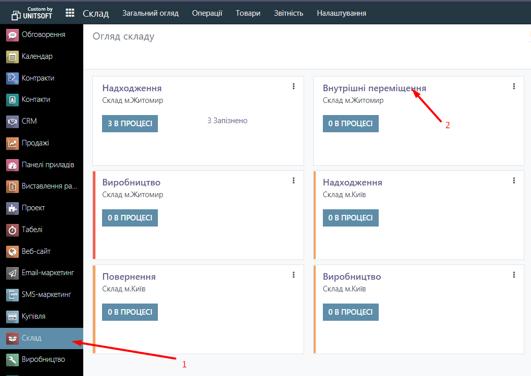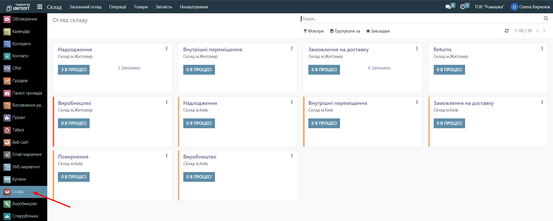 If, for example, one person creates a document for internal transfer, and another person has to execute it, then to find this document, you need to go to the General Overview and in the Internal Transfers group, click the 1 in process button.
