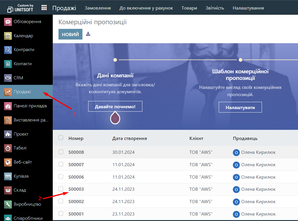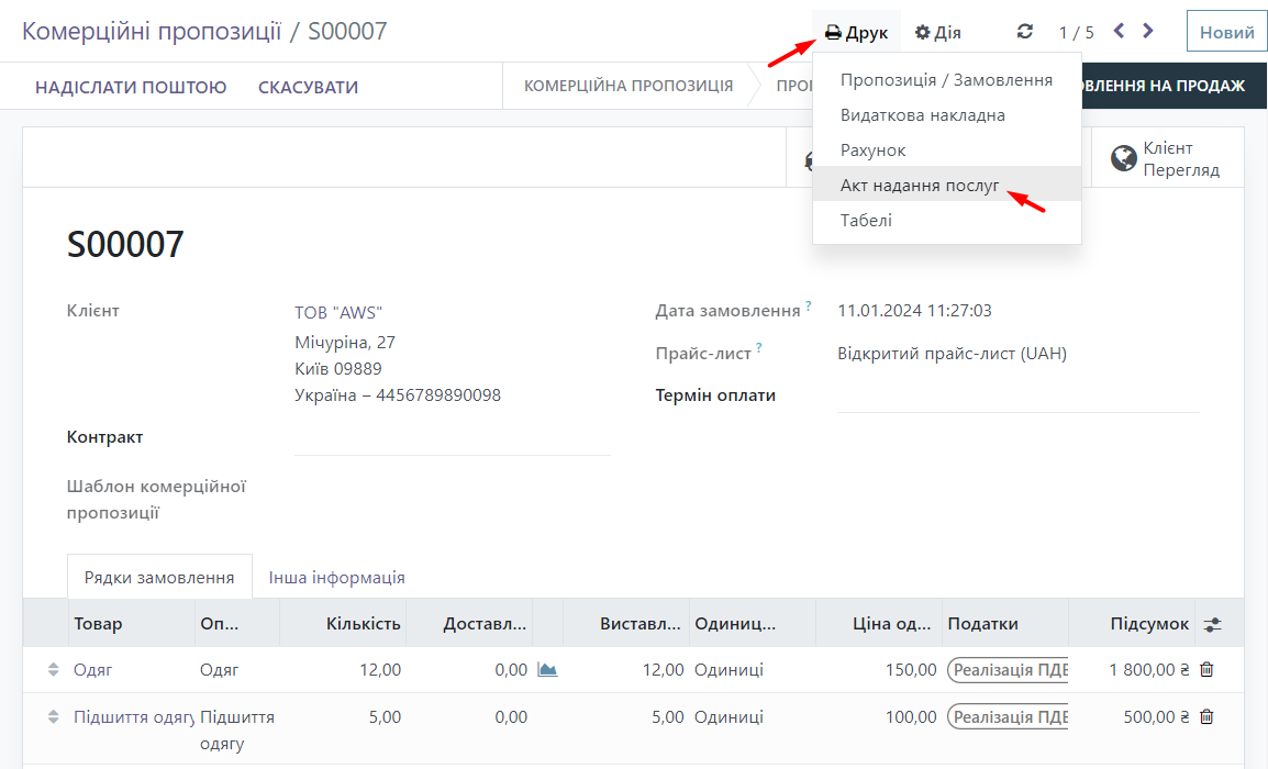Now we can find the printed form of the Service Provision Act. We go to the "Sales" module and select the Commercial Offer.