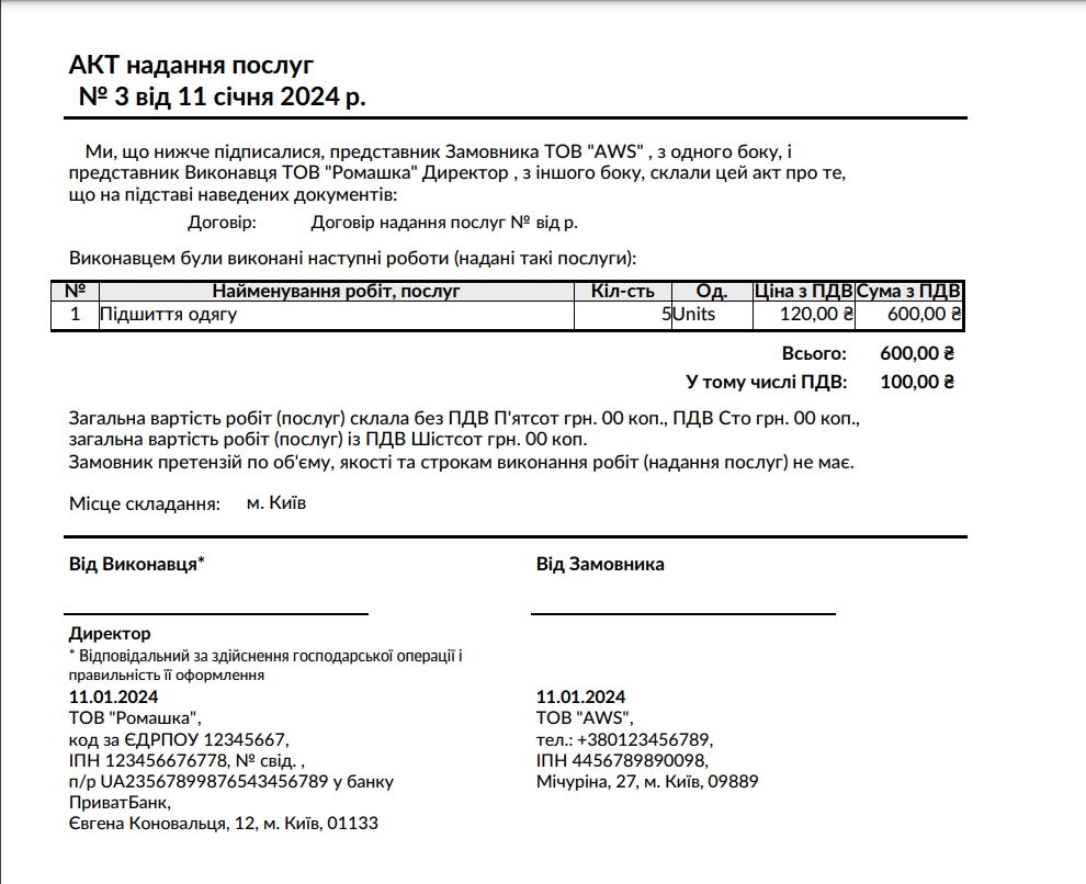 We enter all data, goods, and services, and then click the "Confirm" button.