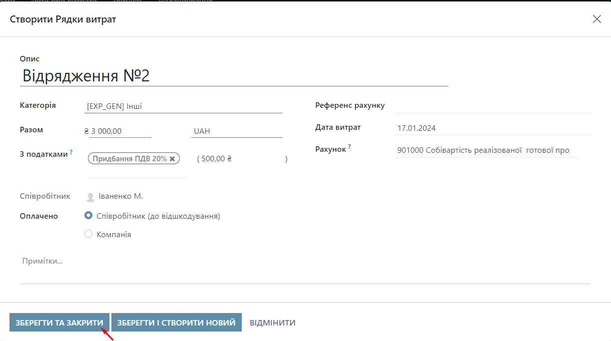 Next, enter the expense information and click the "Save and Close" button.