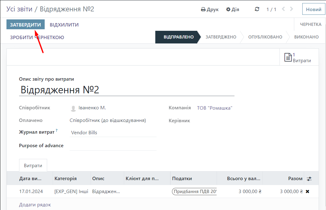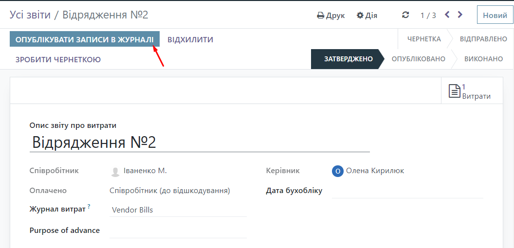 Click the "Send to Manager" button, then "Approve" and "Publish the entry in the journal".