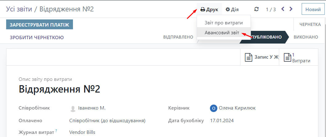 After that, you can download the printed form of the Advance Report. Click the "Print" button and select Advance Report.