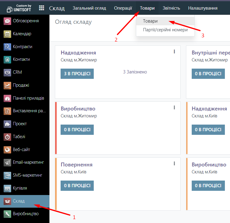 In the Odoo system, there is automatic stock replenishment, which is configured in the product card. To access the product card, go to the Inventory module, click on the Products menu, and select Products.