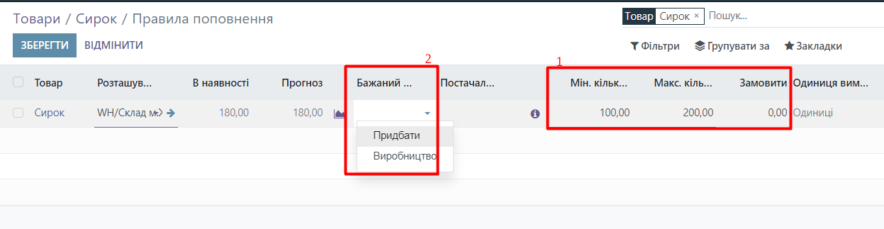 The 2nd highlighted column Desired Route is how the product will be replenished; if the product is purchased, then we choose to purchase and the system will automatically buy from the supplier. If the product is manufactured, then we set it to Production and when the quantity is below the minimum, a production order will be created.