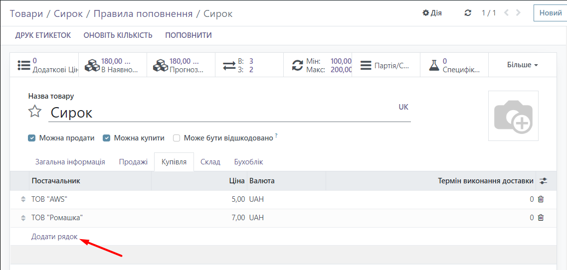 To add a Supplier for this product, you need to go to this Product, enter the Purchase section and click the Add Product button, select the Supplier and specify the Price, then click the Save button. Now, another supplier will be added to the replenishment rules for this product.