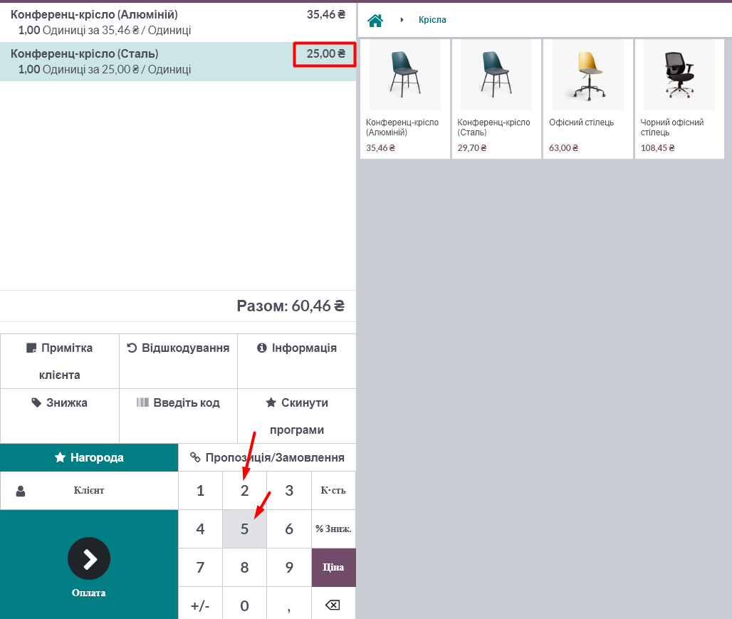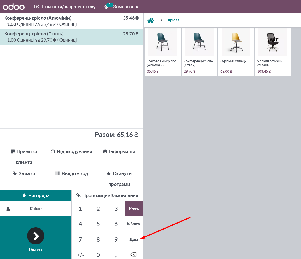 In the "Cash Register" module, the price change function is also active. To change the price, select the item in the receipt and click the "Price" button: