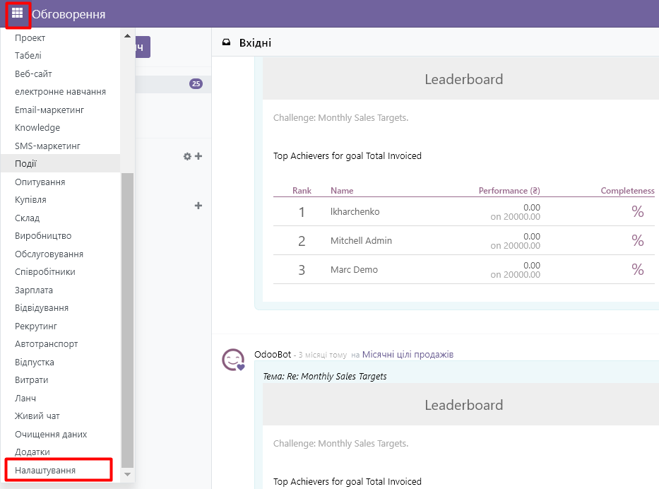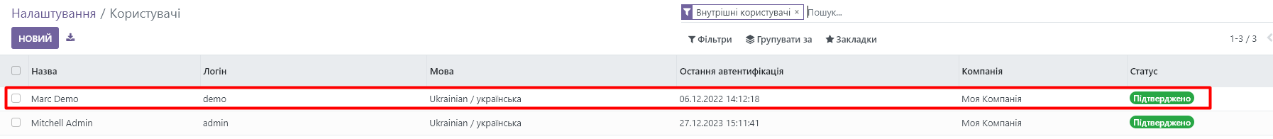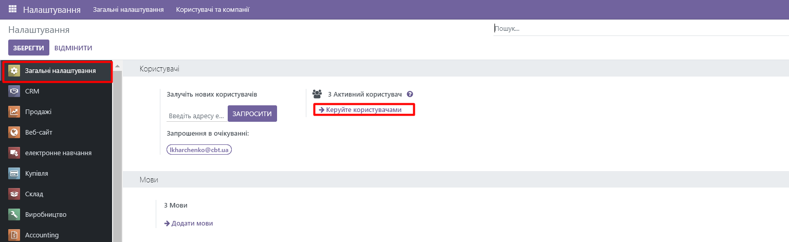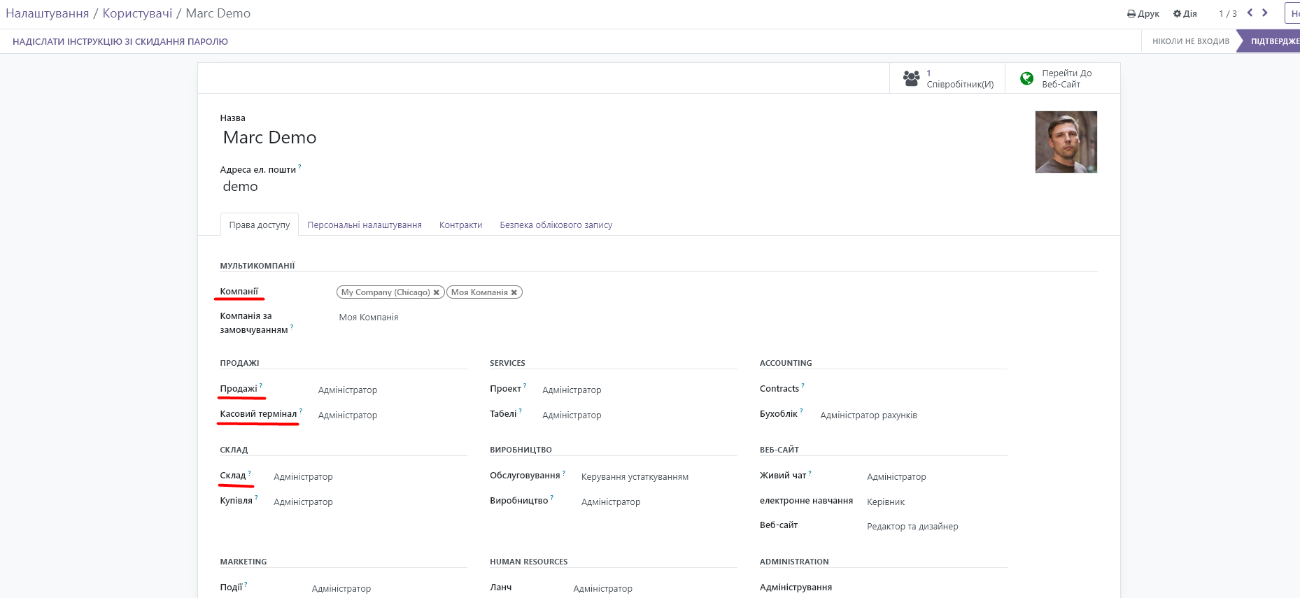 4. In the open window, you will see user access settings for companies and installed modules: