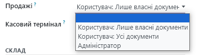 For each of the modules, you can specify your access rights. "Administrator" allows you to configure this module (create units of measurement, price lists, product categories, etc.). "User" grants the right to create documents. If you leave the field empty, the module will be unavailable to this user.