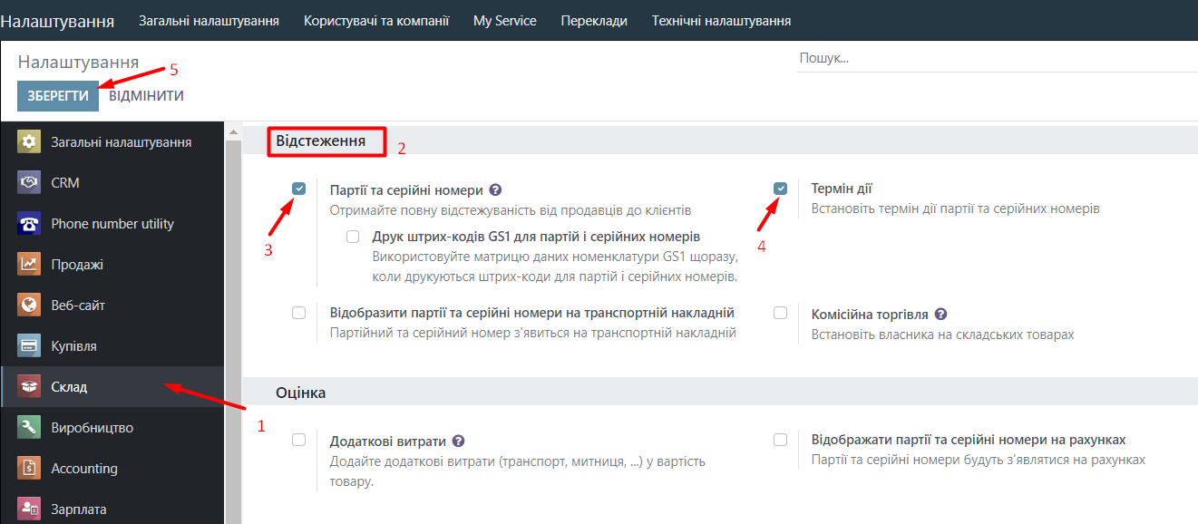 In order to enable batch and serial number tracking, you need to find the Tracking group in the warehouse settings and check the "Batches and serial numbers" option. And if you have food products, you also need to check the "Expiration date" option for them.
