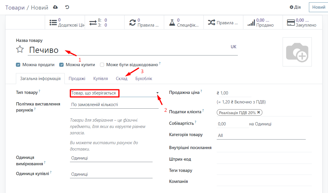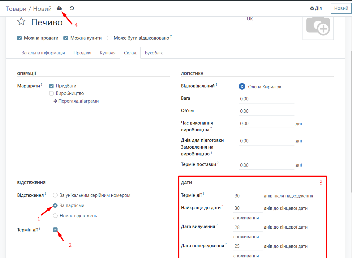Now you can check that these settings have been enabled by going to the Sales module, clicking on Products in the top menu, and selecting Products. Click the New button and create a product, for example, Cookies. Specify the name and type of product (if the product will be tracked, the type of product should be "Storable Product"). Then go to the Inventory tab, in the Tracking group specify what the product will be tracked by, in this case by batches, if necessary specify the expiration date, you can specify how many days after receipt the product will spoil, how many days it needs to be removed, etc. After everything, click the Save button.