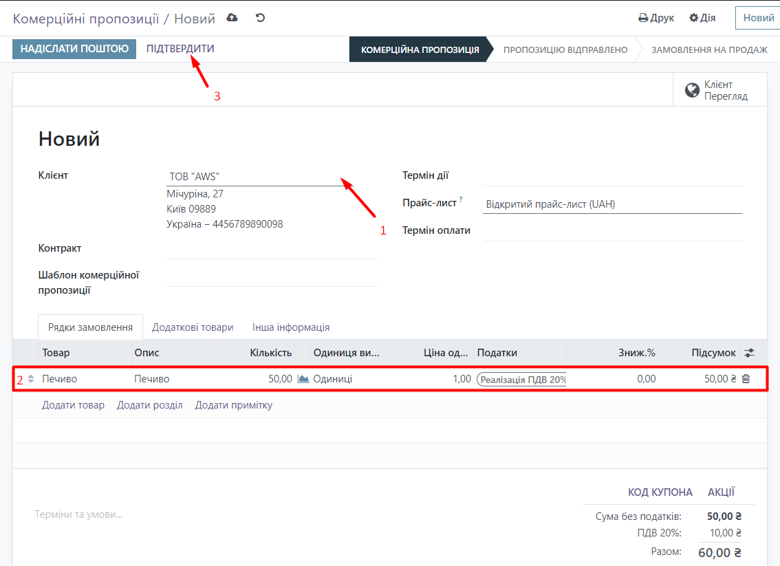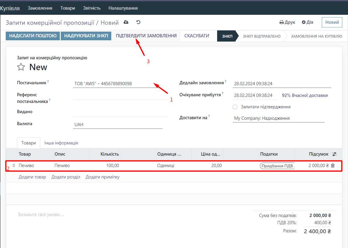Now let's purchase our product. Go to the Purchase module and click the New button. Next, specify the supplier, select our product, indicate the quantity and price. Then click the Confirm Order button.