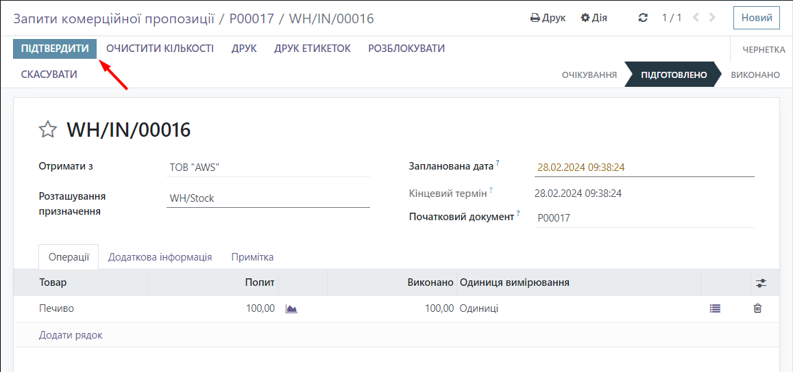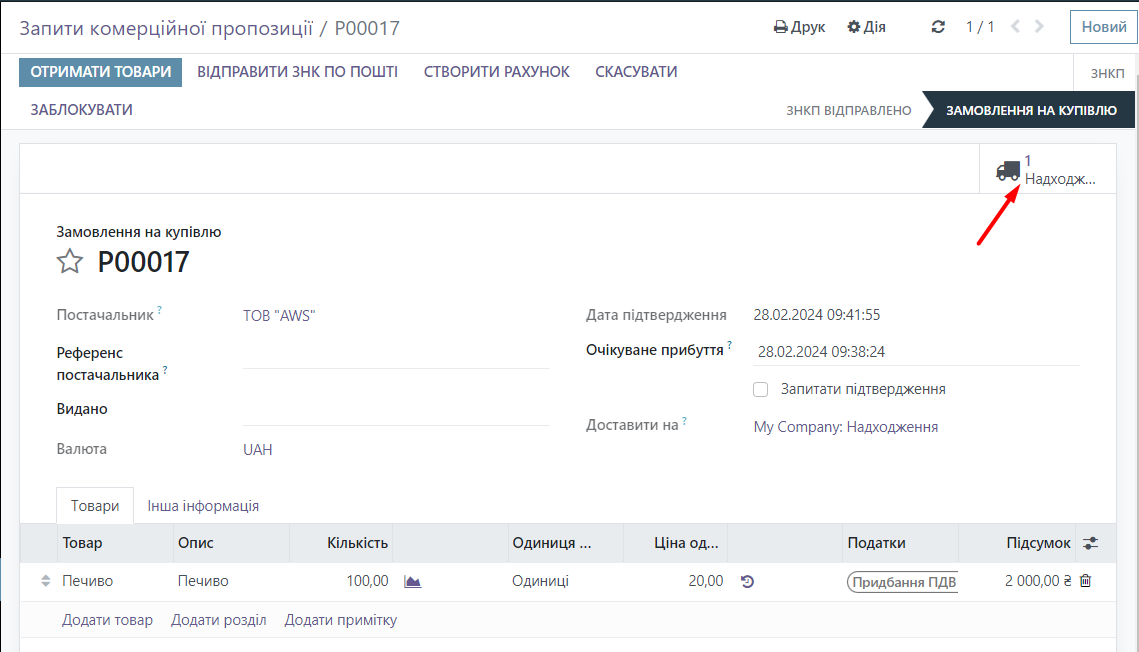 Now you need to receive the goods, click on Receipt.