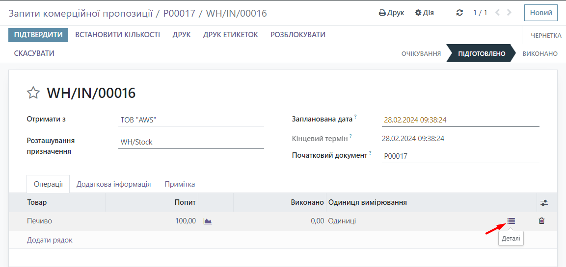 After this, to process this product, it is necessary to specify the batch number. To do this, click the Details button. A window will appear where you need to enter the batch number, and then click the Confirm button. The batch number can be entered manually, as shown, or the system will generate it automatically (by date, for example).