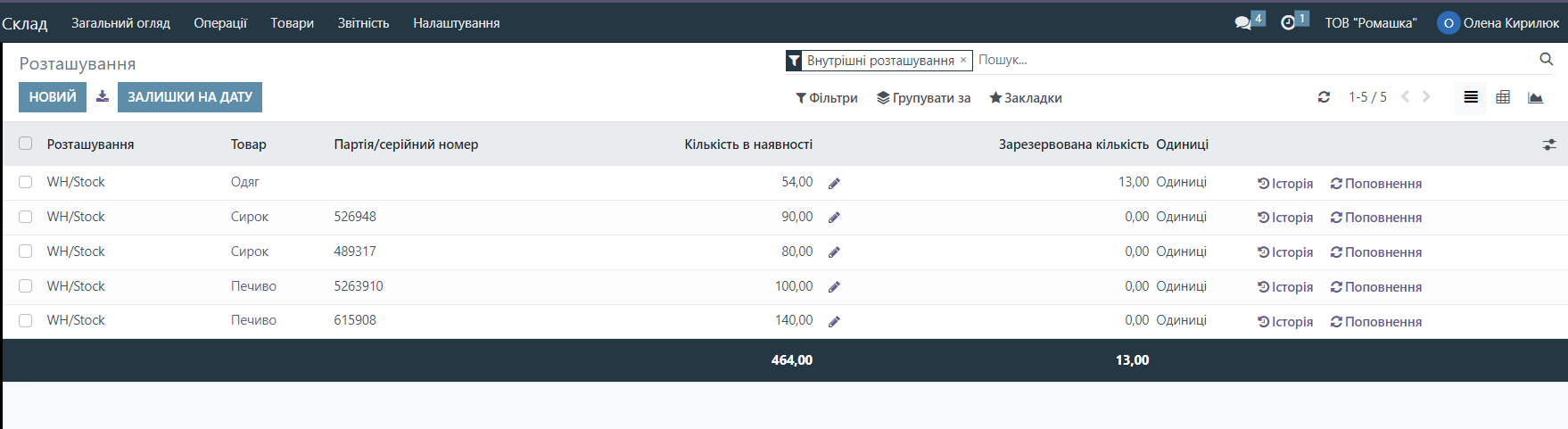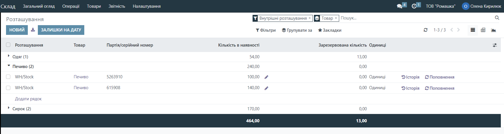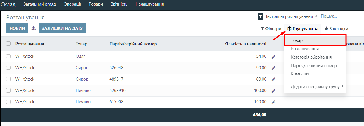 Now we can see how much stock we have in what quantity and with which batch number. To make it easier to review this report, you can group, for example, by product. To do this, click the Group by Product button.