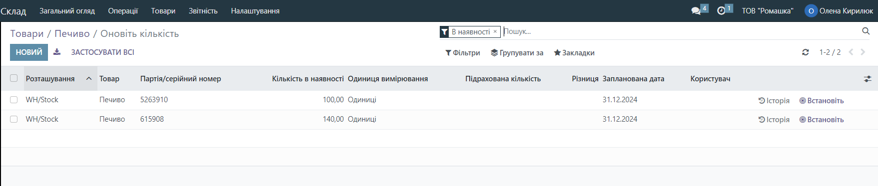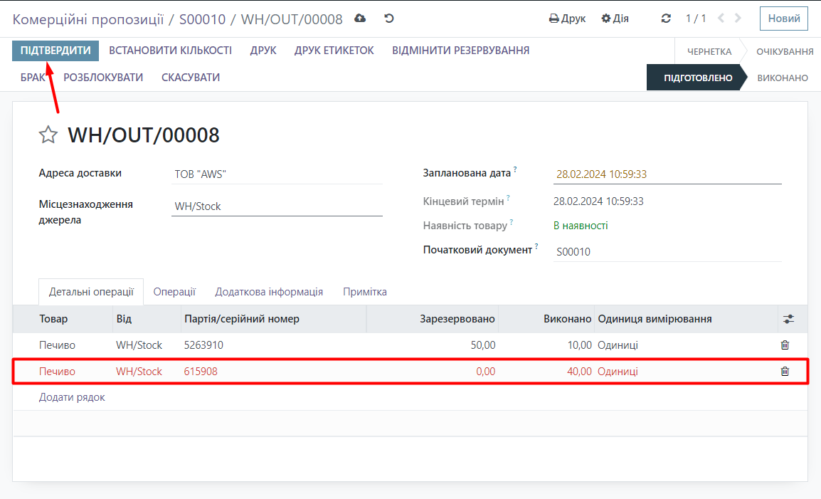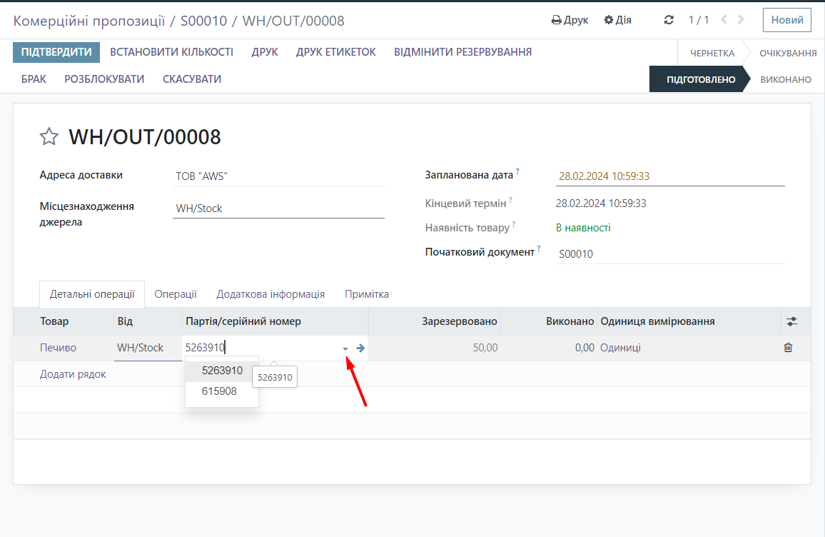 Let's return to warehouse transfers, if this batch number is not suitable, you can choose another batch of this product by clicking on the arrow next to the batch number and selecting the desired one from the list of available options. Alternatively, you can split it into 2 batches.
