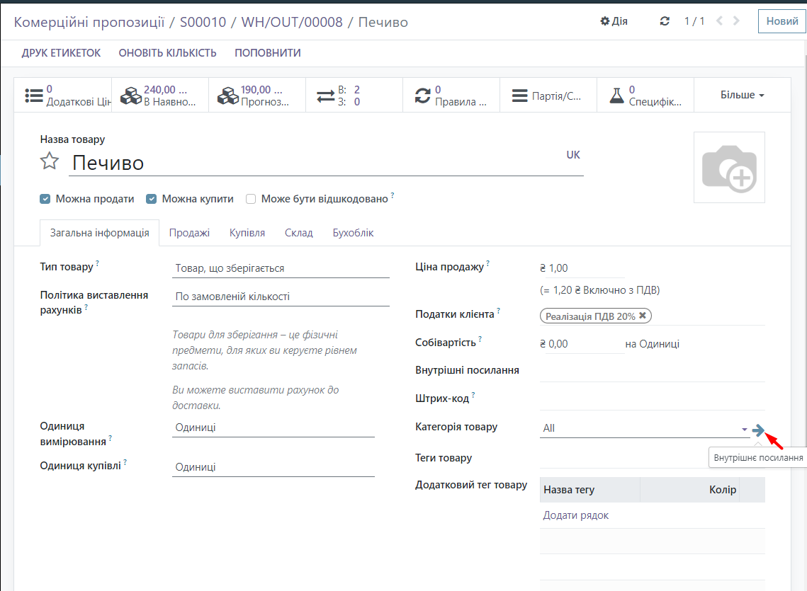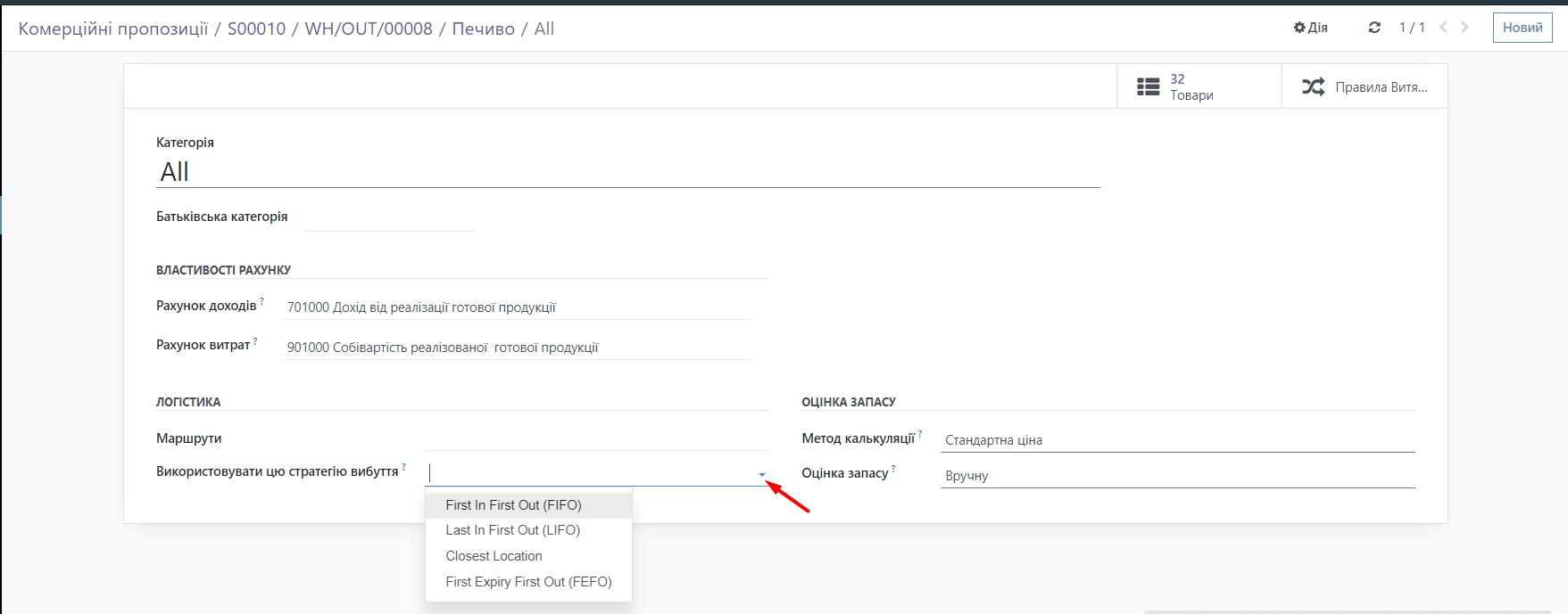 In the Odoo system, in Products, we make settings so that the system knows which batch number for the product should be pulled up. If we go to the product Cookies (double-click on the product name), then go to the internal link of the product category, the product category settings window will open.
