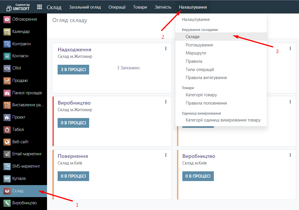 To create another warehouse, you need to go to the Warehouse module and in the menu click Settings, then click Warehouses.