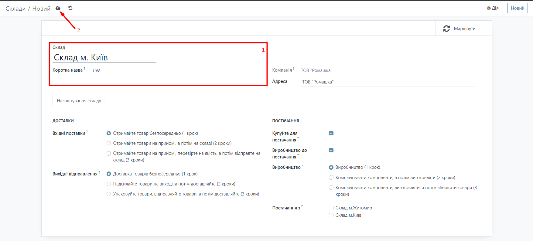 When creating a new warehouse, you need to specify its name and short name. The short name of the warehouse will be indicated in the numbering of documents. After that, click the Save button.