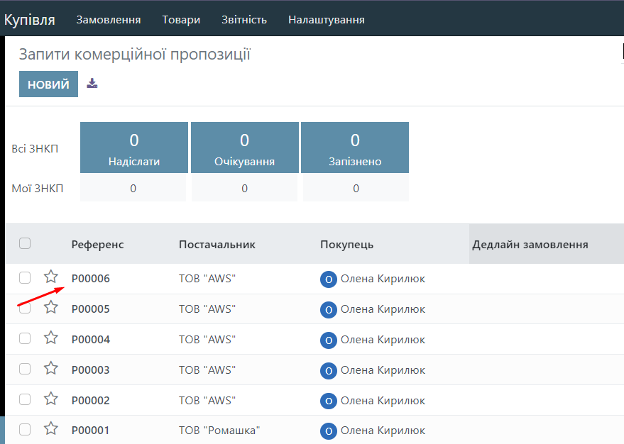 To create a Commercial Offer, go to the "Purchase" module and click the "New" button.