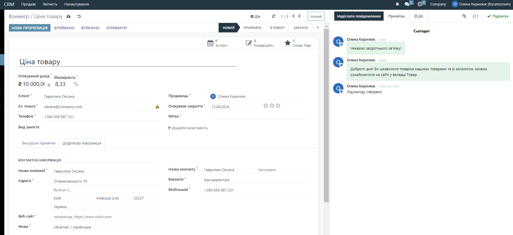 Here is an example of a manually created lead and filling in all fields, as well as correspondence with clients on the right.