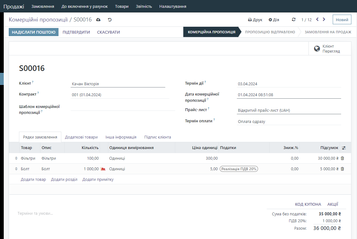 Here is an order created manually without CRM. Here you can specify the client, contract for the order, payment term of the order, products and descriptions, their quantity, price, and discount.