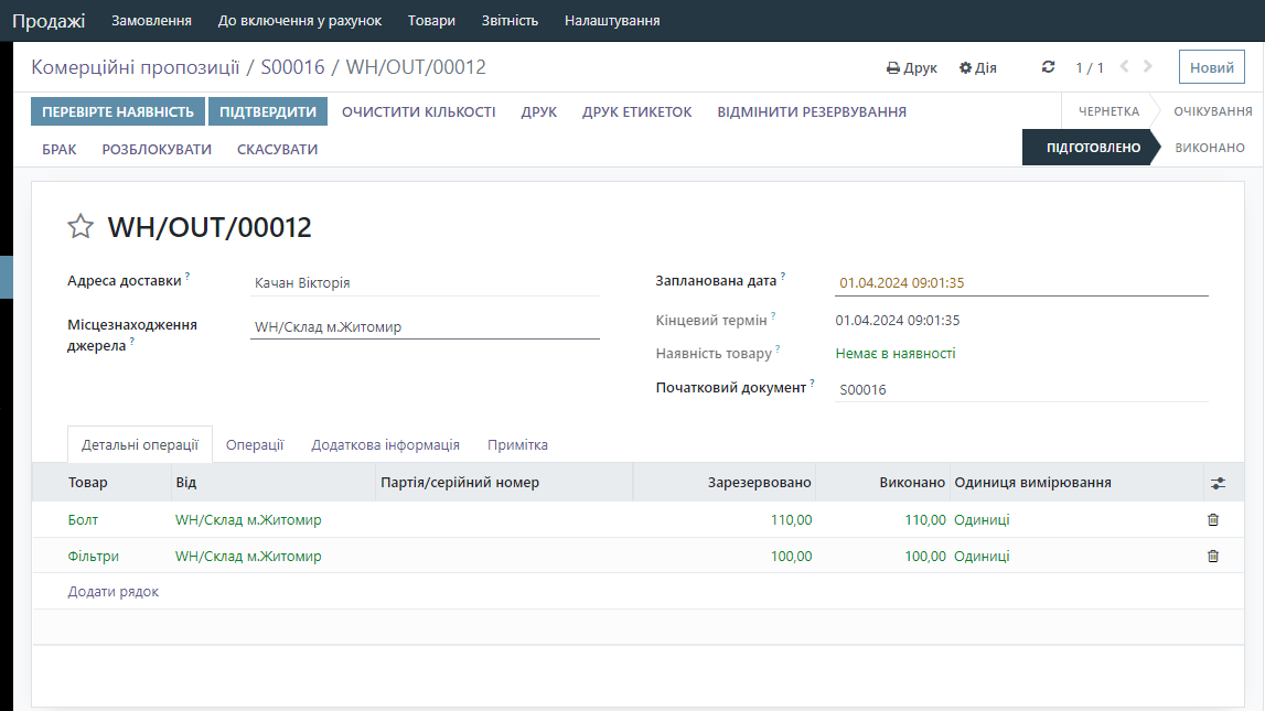 In warehouse operations, we can see the expected quantity of goods for delivery and the actual quantity of goods shipped. You can specify the delivery method and carrier; if there is integration with Nova Poshta, information about the waybill and its status will be displayed. You can also view the weight of the goods to be delivered.