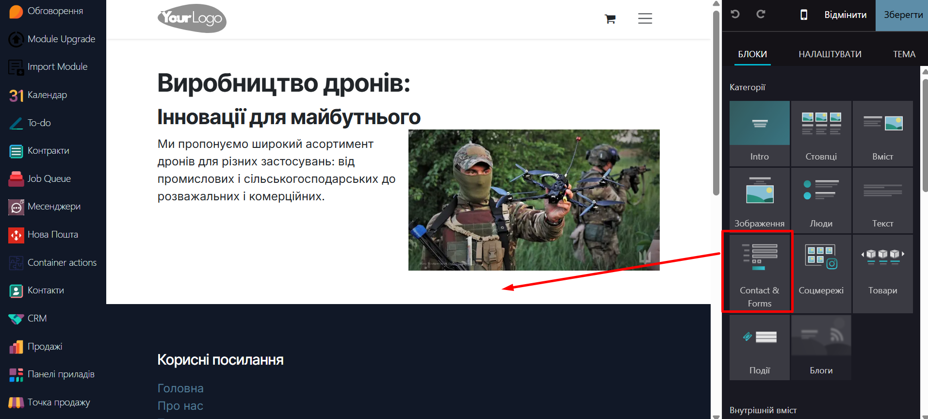 1. In the left panel, find the Contact & Forms block. Drag it onto the website page.