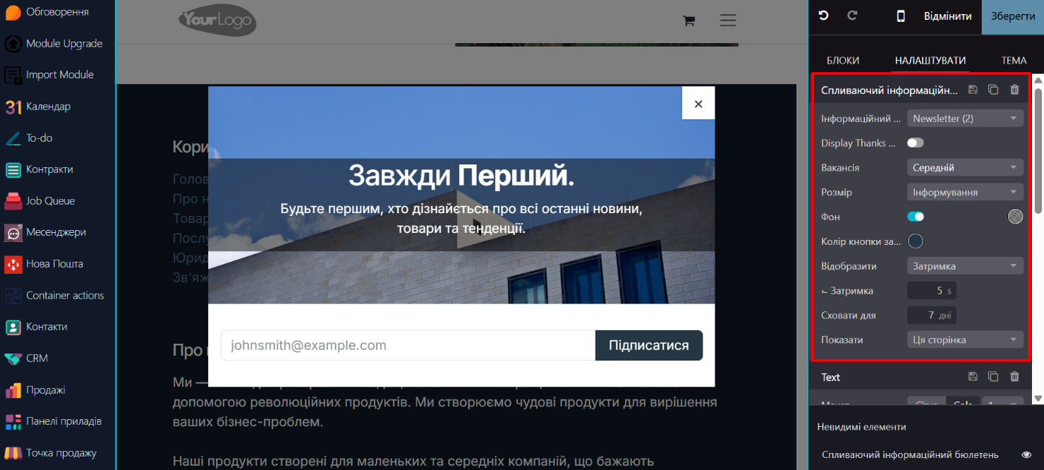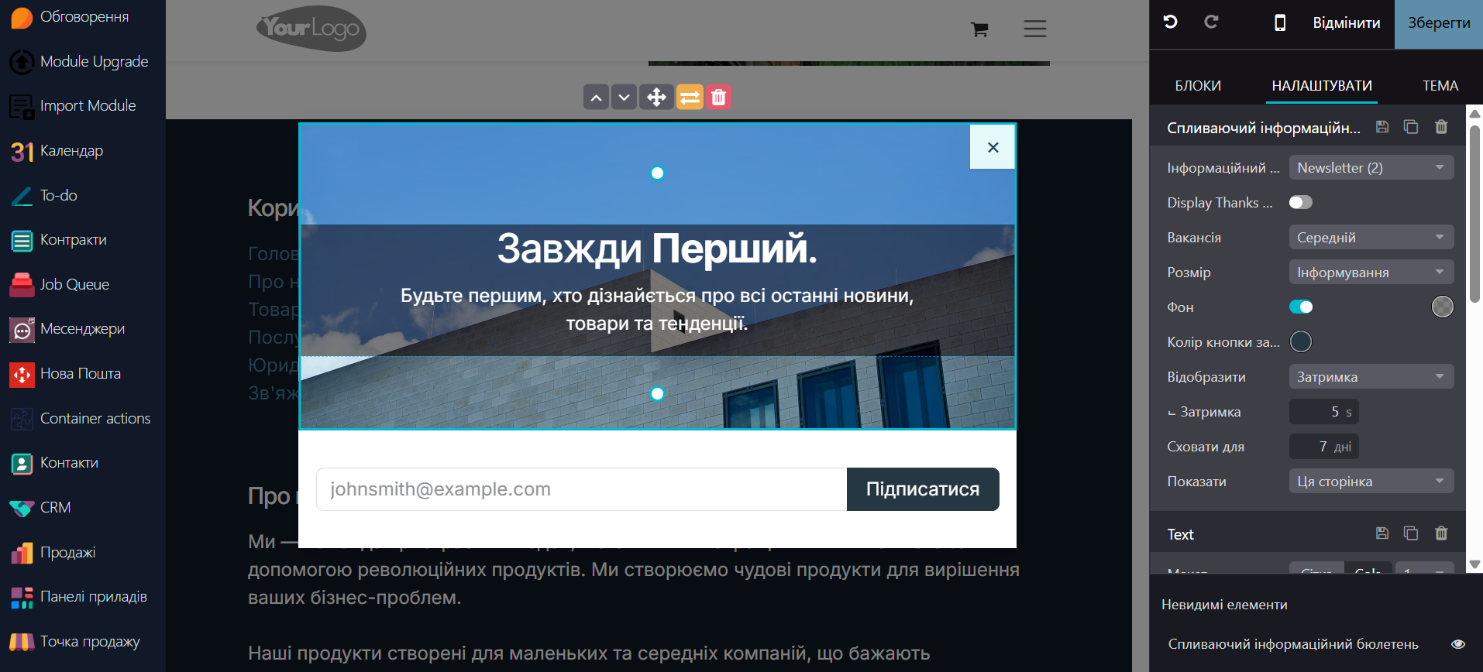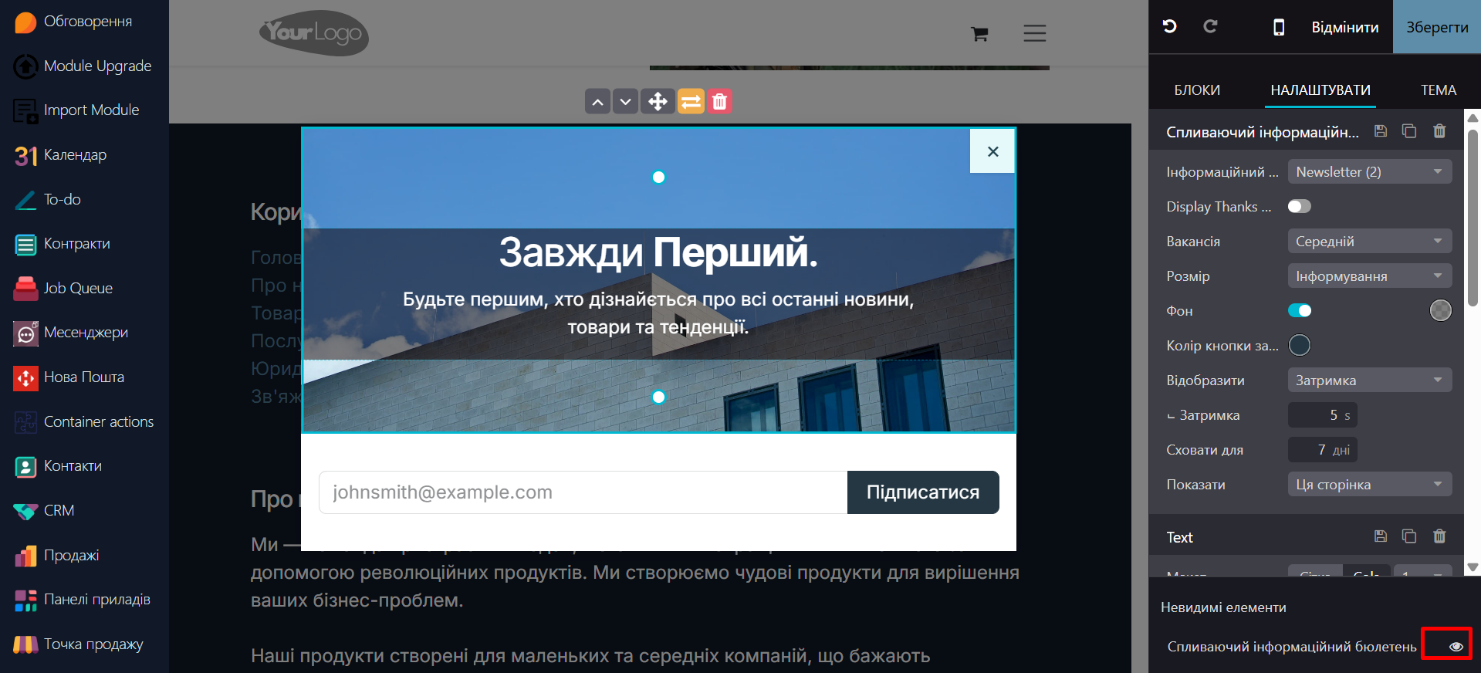 Please note that the visibility of the pop-up in editing mode is controlled by a separate button (icon in the form of an eye):