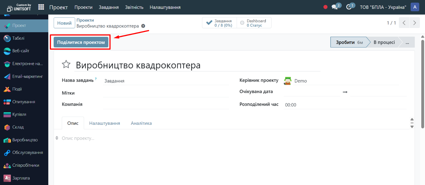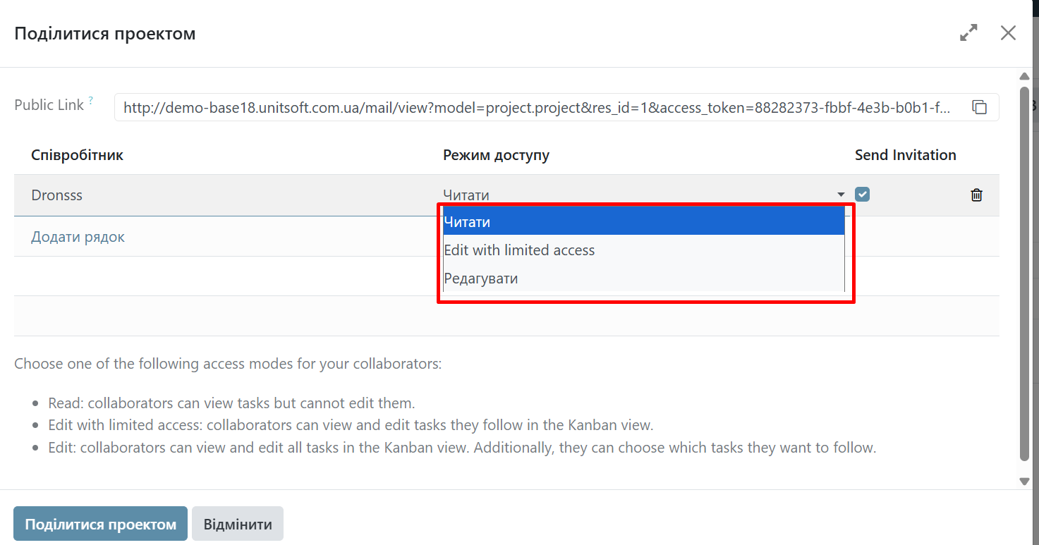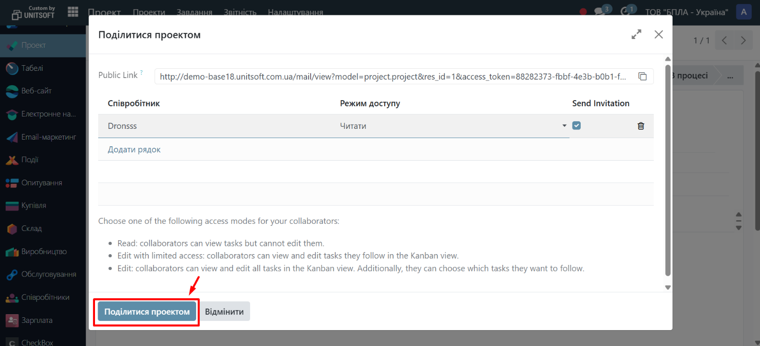 The 'Share Project' feature allows you to grant access to your project to your clients or colleagues without needing to open the entire Odoo system for them.