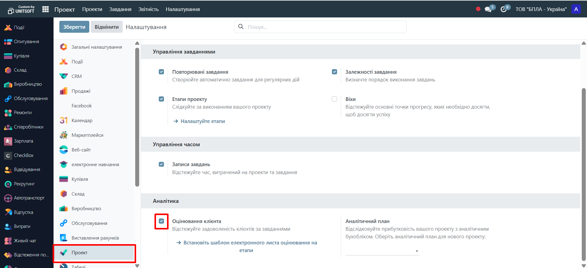 2. In the "Analytics" section, check the "Client Evaluation" box and choose the evaluation method - upon reaching a certain stage, or periodically while the task is at a certain stage: