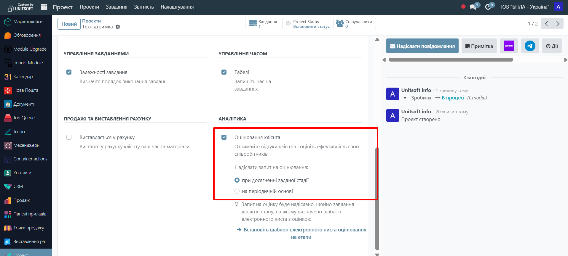 The 'Client Evaluation' function in the 'Projects' module allows you to automatically request the client to evaluate the completed work (by task or project) — when the task transitions to a specified stage or periodically. An email with a link to the evaluation form is sent automatically according to the template you specify.