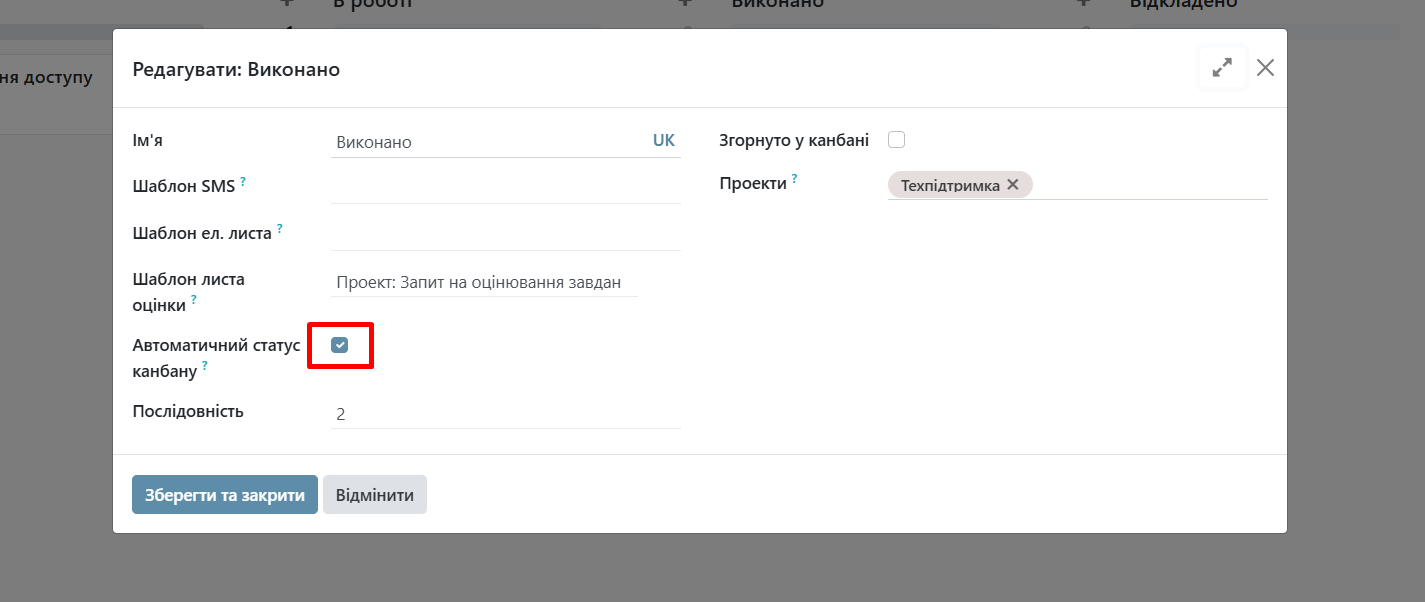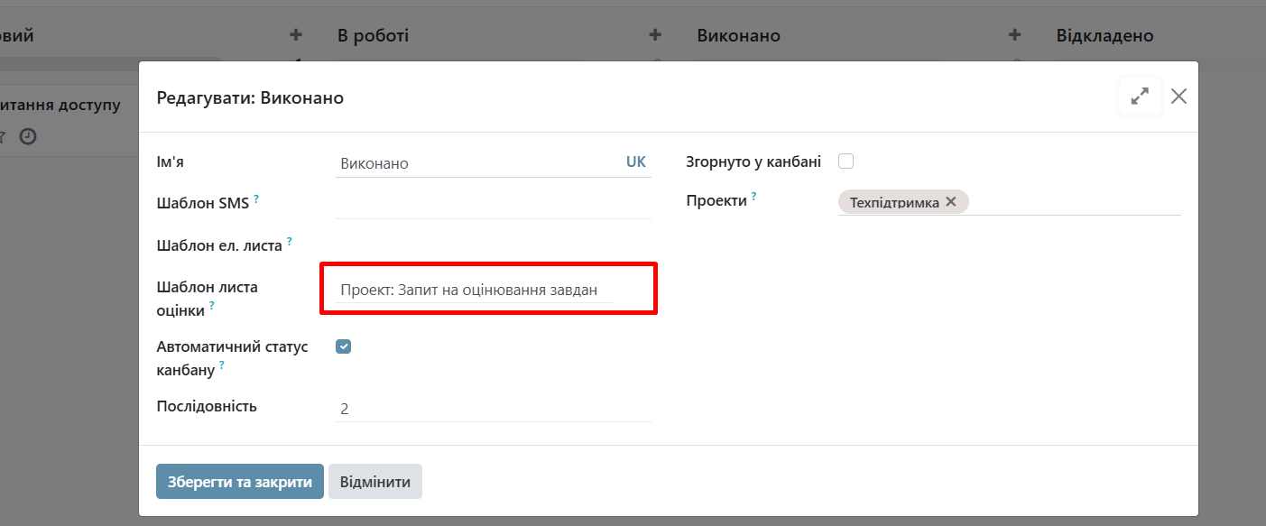 3. Optionally: you can enable in the stage settings 'Automatic Kanban Status' — then the task status will change depending on the client's evaluation (for example, 'Approved' for positive feedback, 'Request for changes' for neutral or negative feedback).