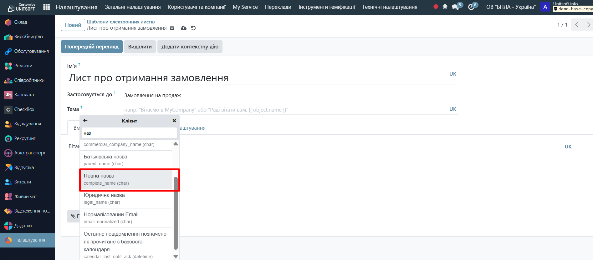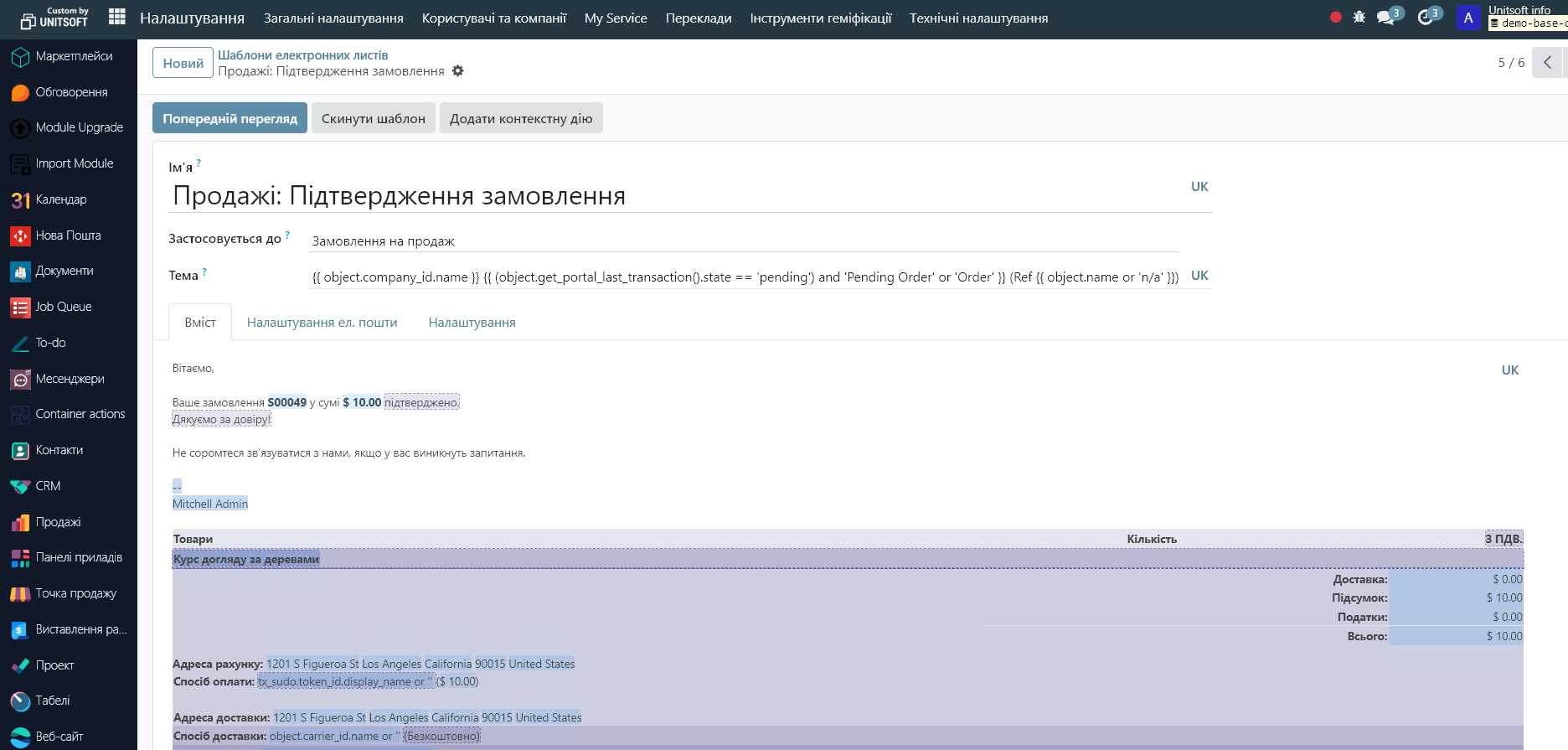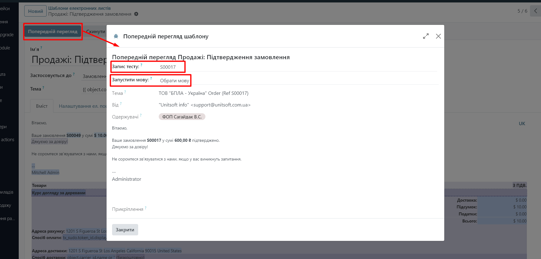 Click the 'Preview' button. Specify the test record (e.g., order – if the email is to be sent based on orders) and the language. Check the correctness of the data display: