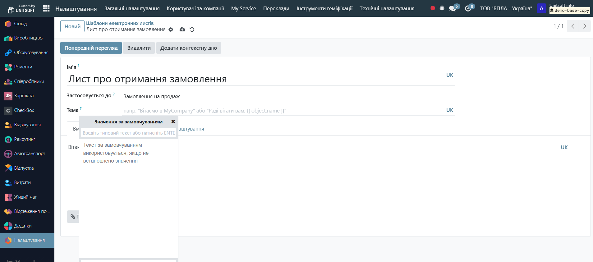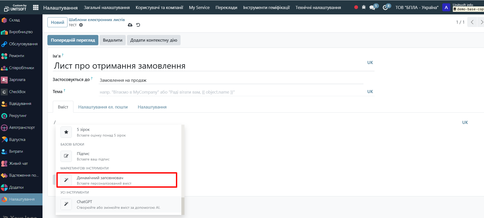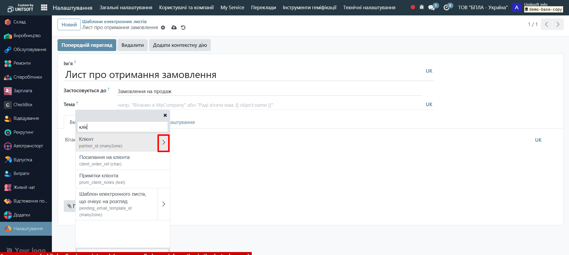 Click the 'Preview' button. Specify the test record (e.g., order – if the email is to be sent based on orders) and the language. Check the correctness of the data display:
