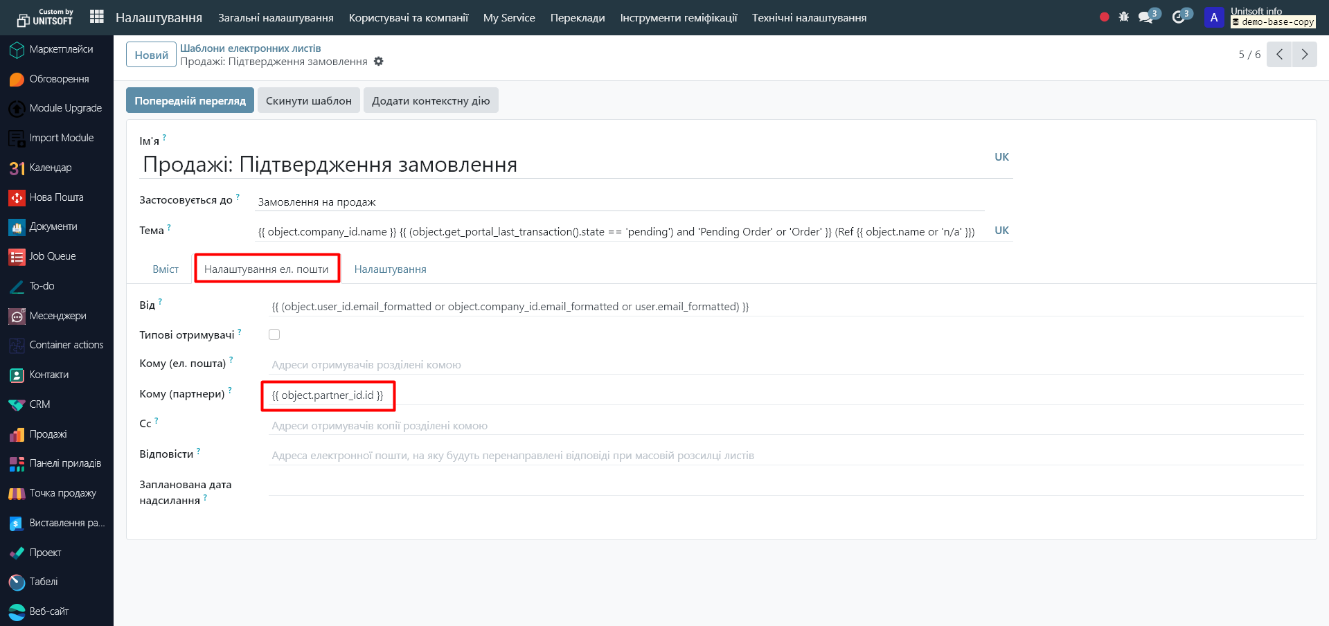 In the 'Email Settings' tab in the 'To (Partners)' field, specify the recipients. For example, if the recipient is dynamic – the order client, then here we specify {{ object.partner_id.id }}