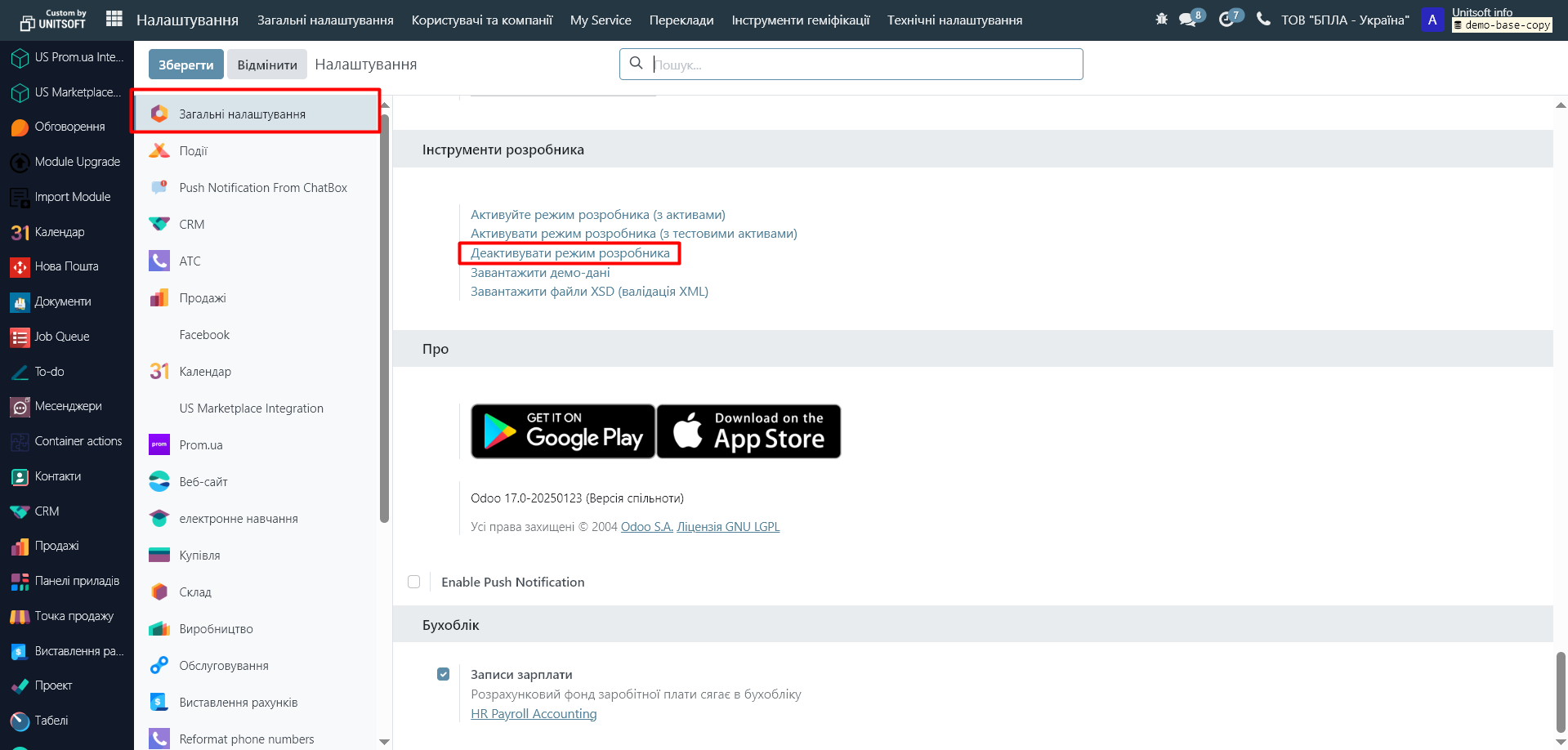 Go to the 'Settings' module. In 'General Settings', scroll down the page and click 'Deactivate Developer Mode' (Deactivate the Developer Mode).