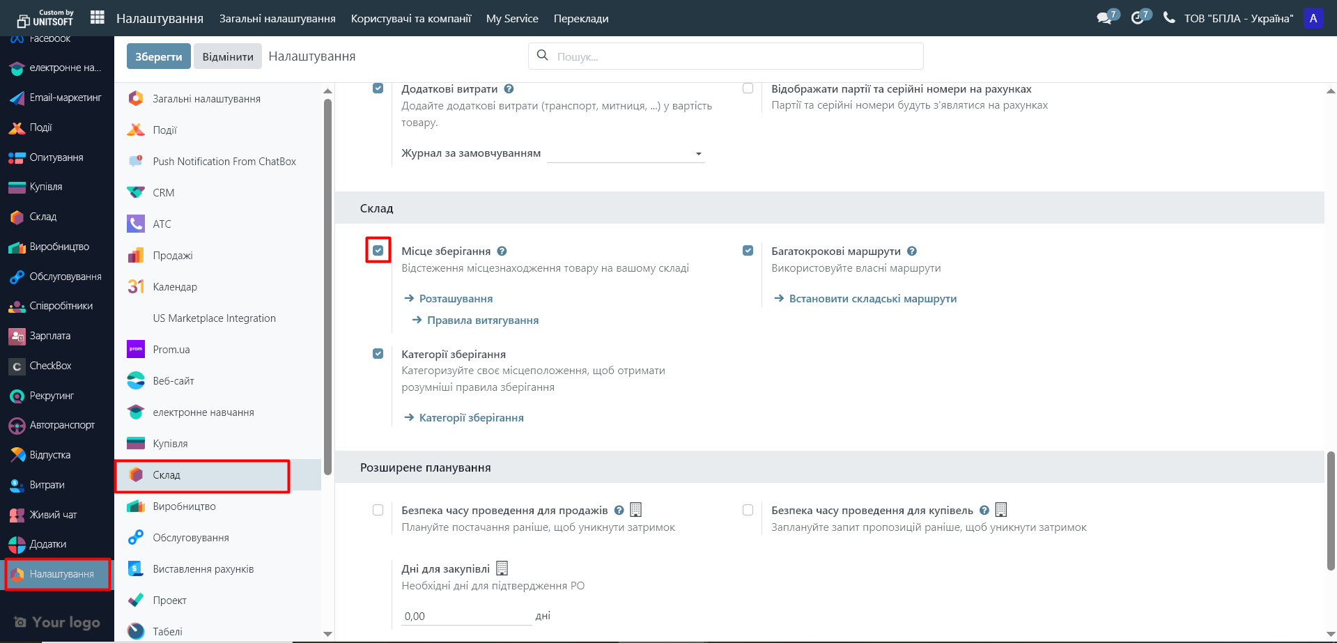 In the 'Warehouse' section, enable the check next to the 'Storage Locations' setting: