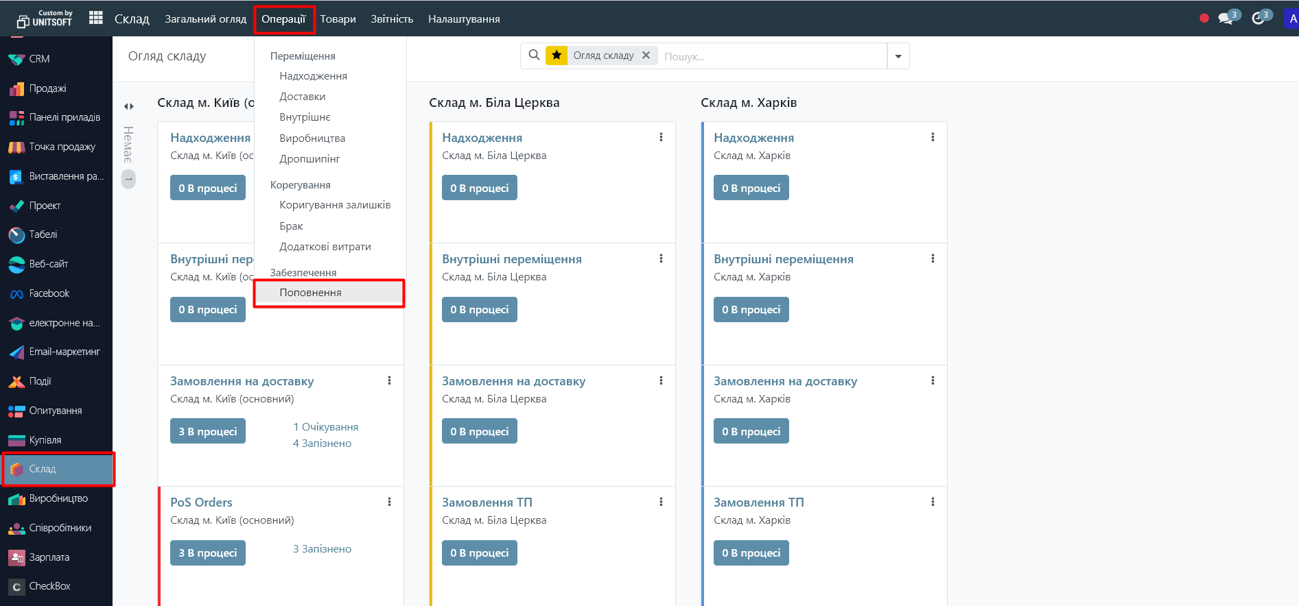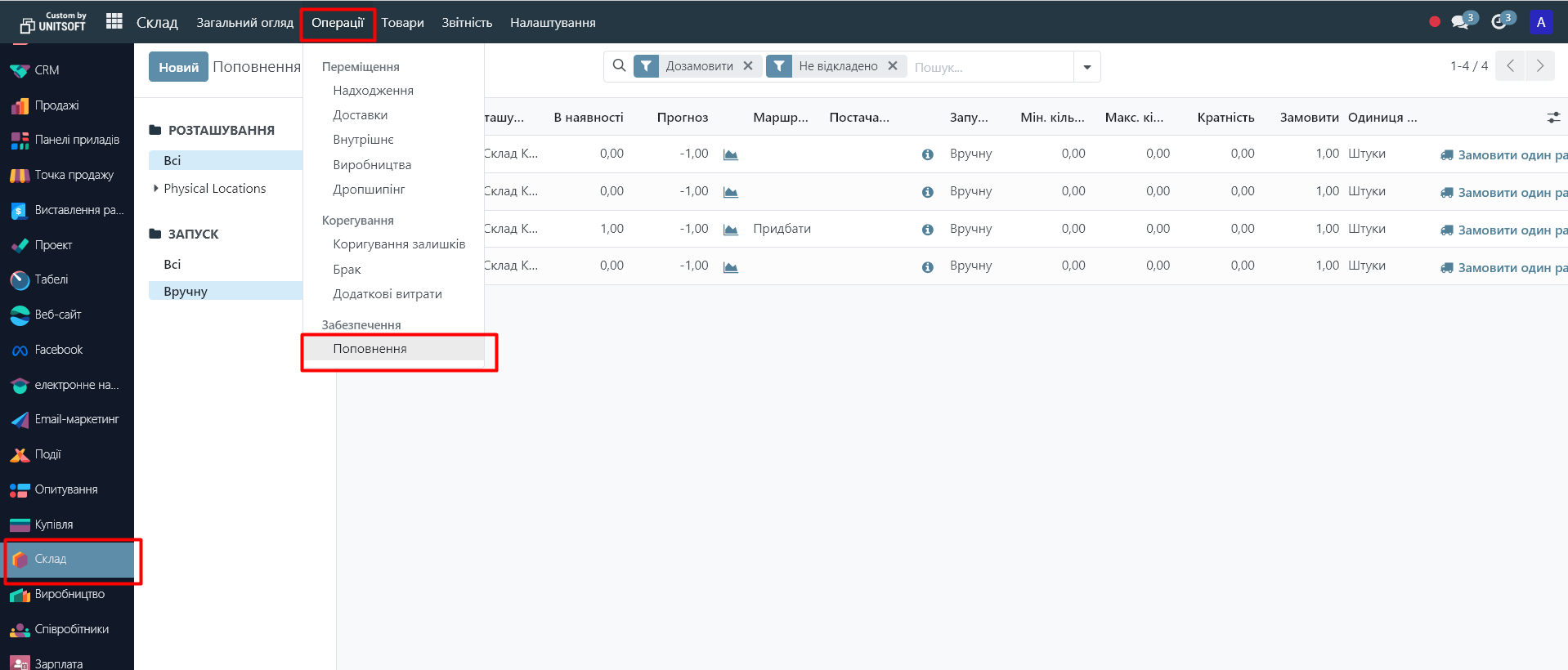 2) in the 'Warehouse' module, go to the 'Operations' - 'Replenishment' menu: