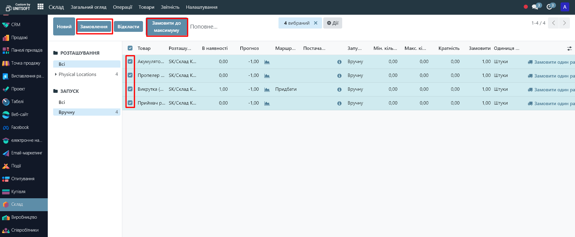 For products with the 'Manual Launch' parameter, the system does not automatically create documents when the product reaches the minimum stock level: