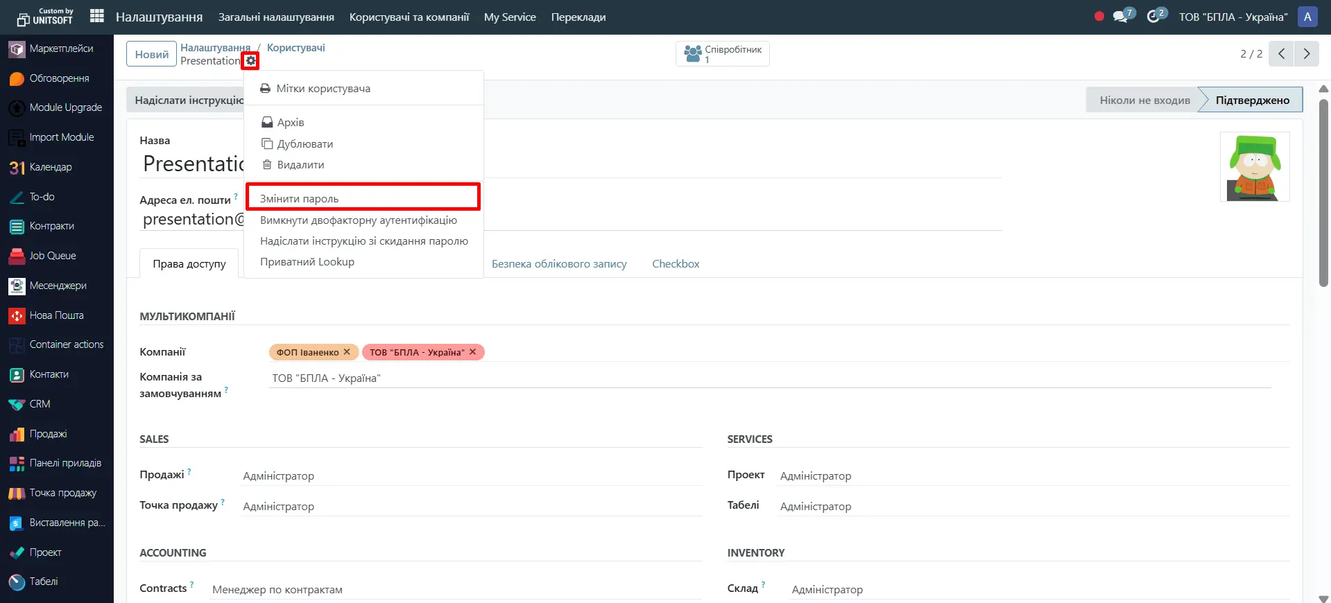 Цей спосіб дозволяє створити користувача вручну без відправки запрошення на електронну пошту. Його зручно використовувати, якщо поштовий сервер у базі не налаштований або якщо потрібно швидко створити доступ і передати дані для входу користувачу окремо. Нижче описано процес ручного створення користувача в Odoo.
