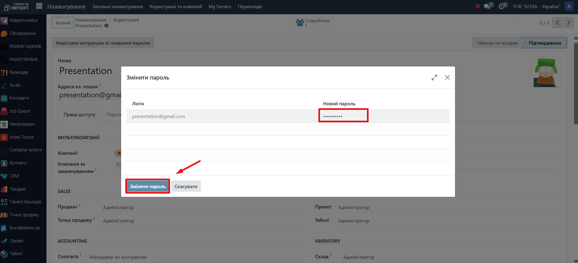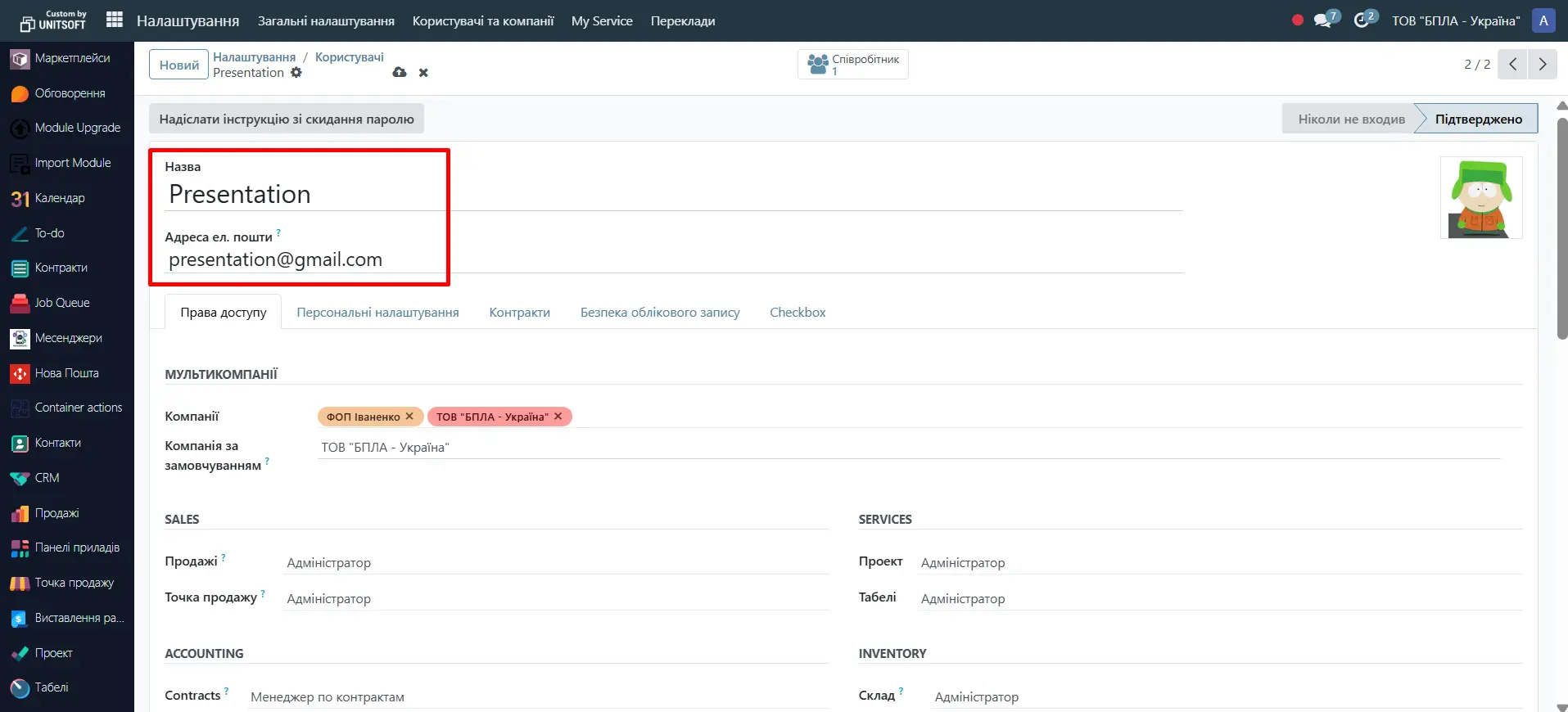 4. Вкажіть назву користувача, електронну пошту, нижче налаштуйте права доступу до модулів: