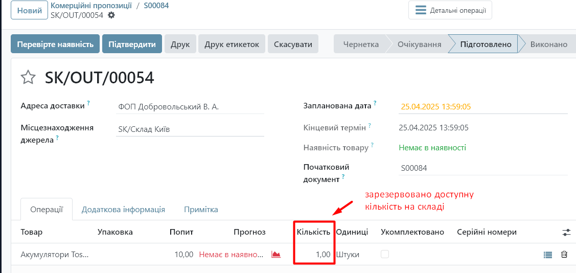 Odoo автоматично створює складський документ, який і виконує резервування доступного товару на складі.