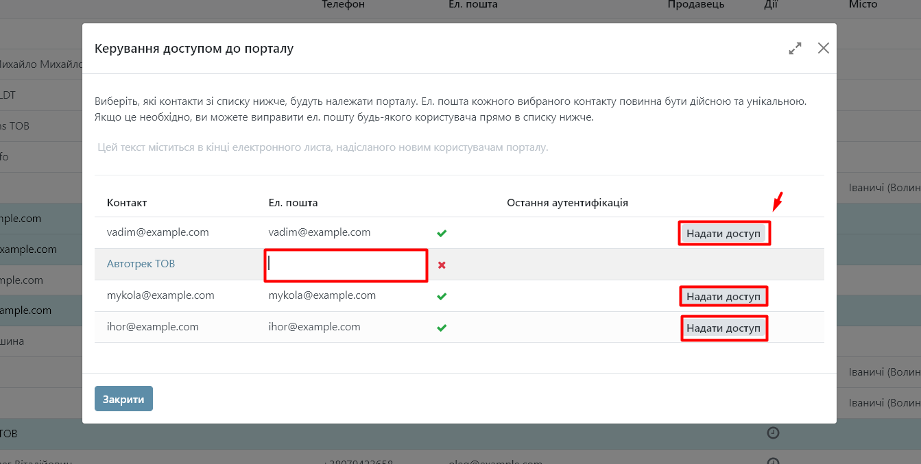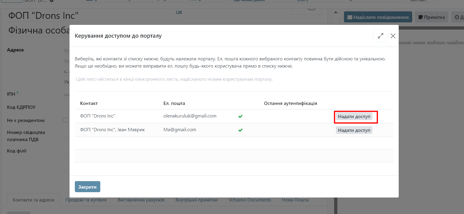В новому вікні відкриється інформація про компанію та її контактних осіб. Натисніть кнопку «Надати доступ»: