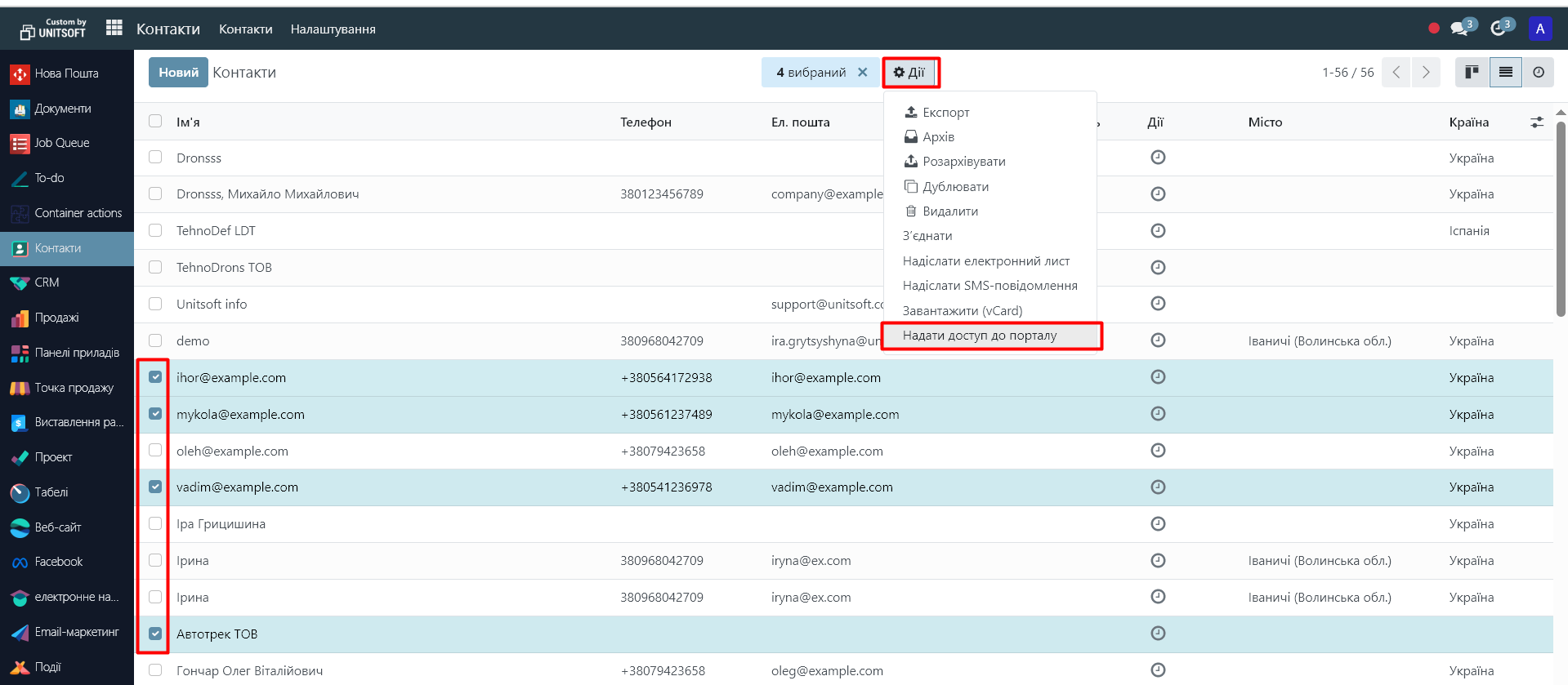 Виділіть необхідні контакти. Натисніть кнопку «Дія» - «Надати доступ до порталу»: