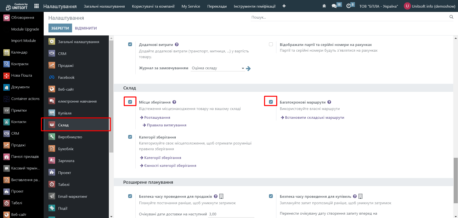 1.2. В розділі «Склад» проставте відмітки біля «Місця зберігання» та «Багатокрокові маршрути»: