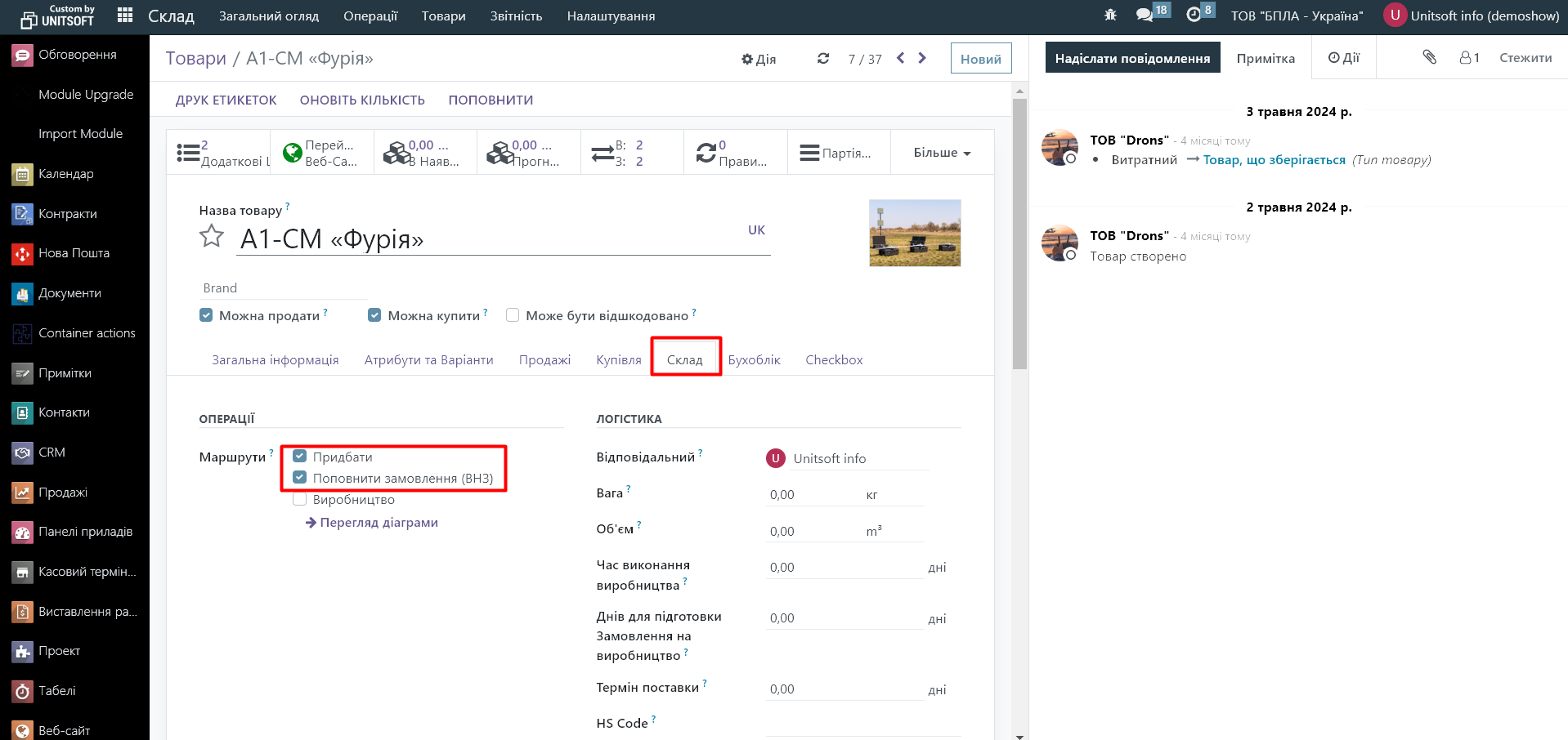 3.1. Відкриваємо картку товару, для якого має автоматично створюватися замовлення постачальнику. Переходимо в розділ «Склад». В розділі «Маршрути» ставимо відмітки біля «Придбати» і «Поповнити замовлення»: