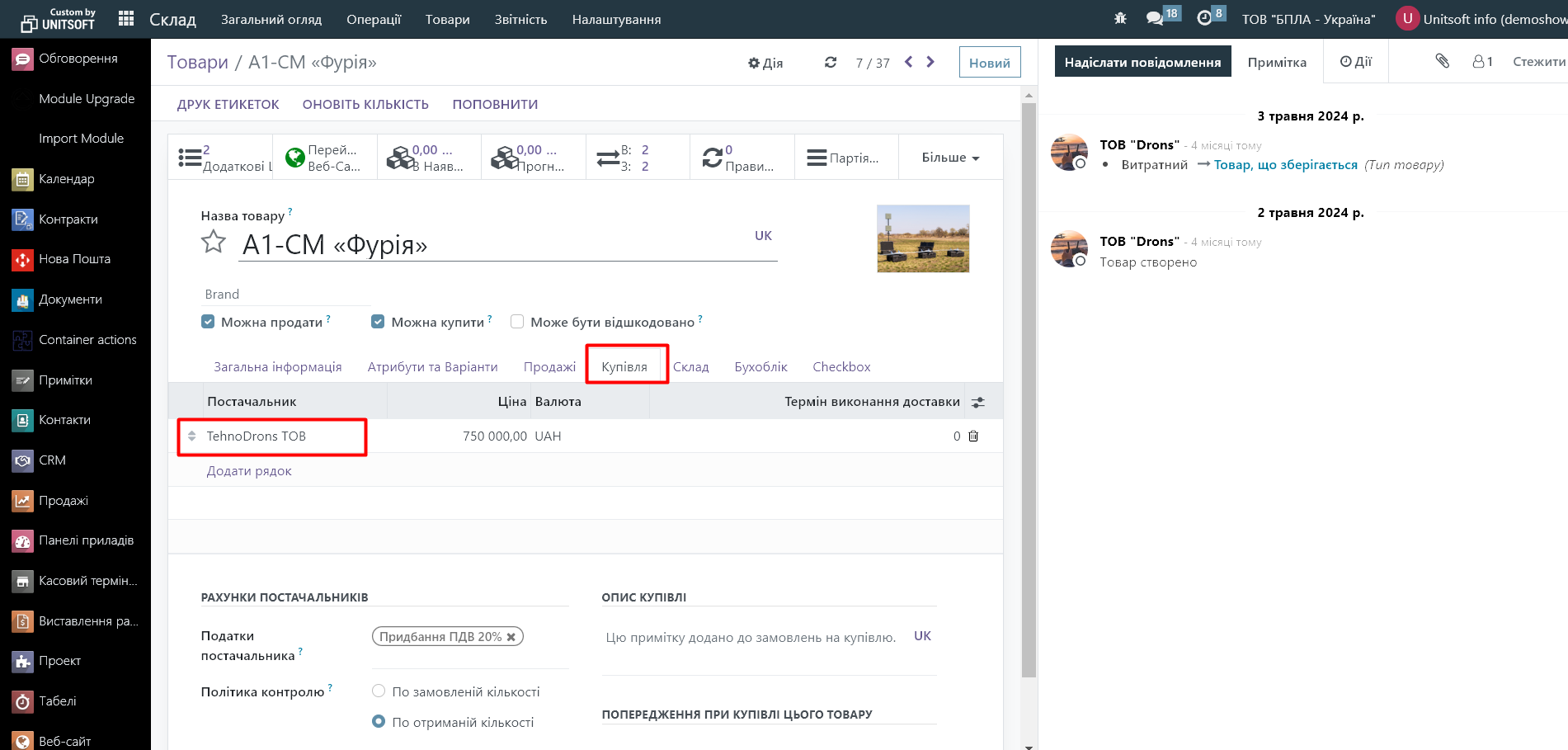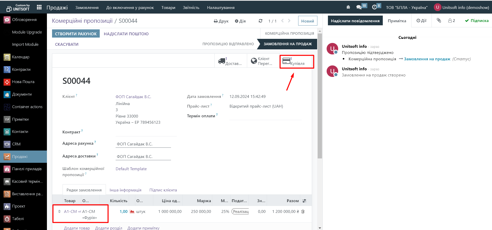 Створюємо замовлення на продаж налаштованого товару. В момент його підтвердження має автоматично згенеруватися замовлення на купівлю в статусі чернетки: