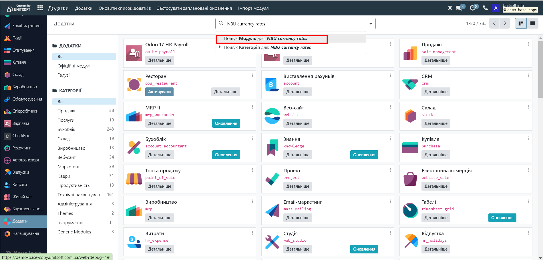 У пошуковій стрічці заберіть фільтр «Додатки» і введіть назву необхідного модуля («NBU currency rates» – для імпорту курсів з НБУ, «Privat24 currency rates» - для імпорту курсів з Приватбанку, «kw_monobank» - для імпорту курсів з Монобанку):