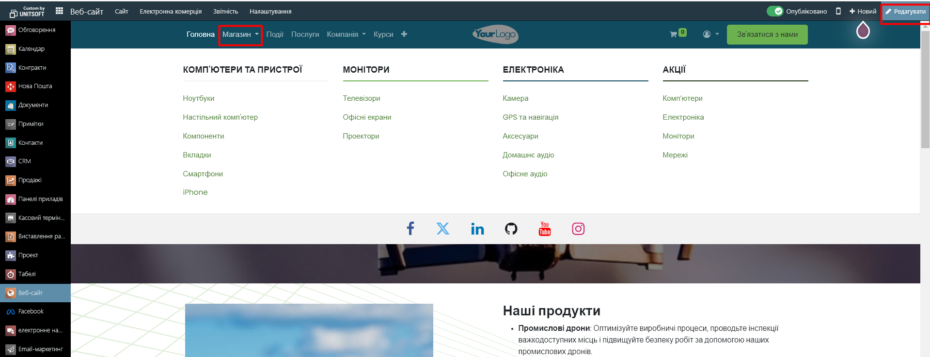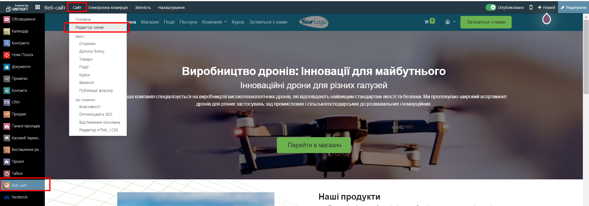 Перейдіть в модуль «Веб-сайт» - меню «Сайт» - «Редактор меню»: