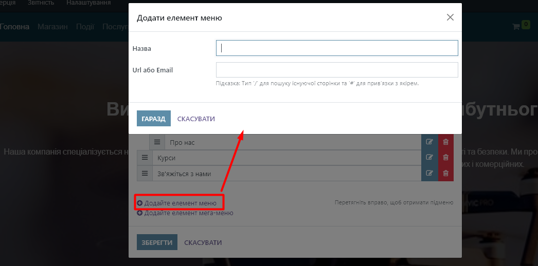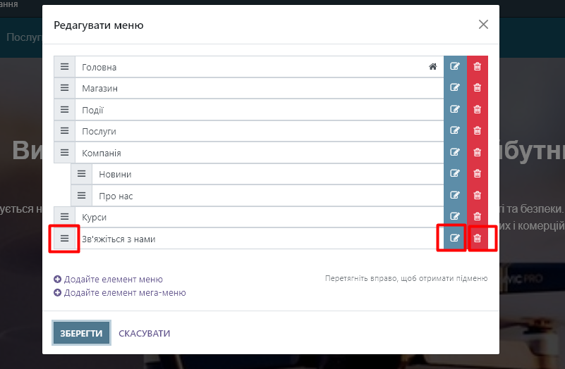 - Перейменувати пункт меню або змінити його URL, натиснувши на іконку редагування.